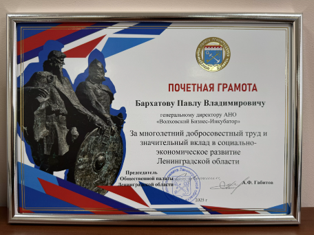 Общественная палата Ленинградской области отметила труд генерального директора АНО «Волховский Бизнес-Инкубатор» Павла Бархатова почетной грамотой, а работу всего коллектива — благодарностью. Мы, в свою очередь, благодарим за высокую оценку нашей работы!